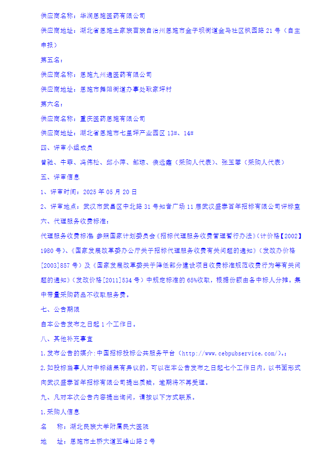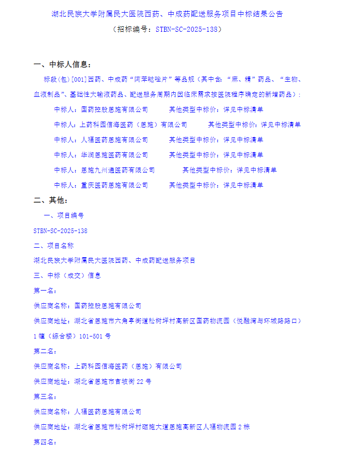 【湖北民族大学附属民大医院】湖北民族大学附属民大医院西药、中成药配送服务项目中标结果公告