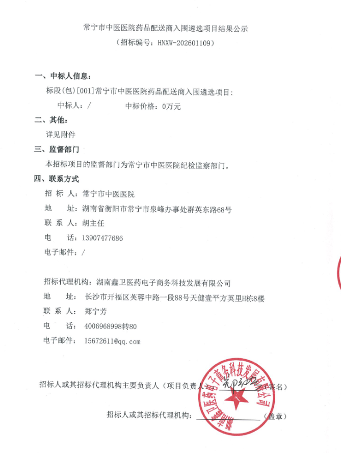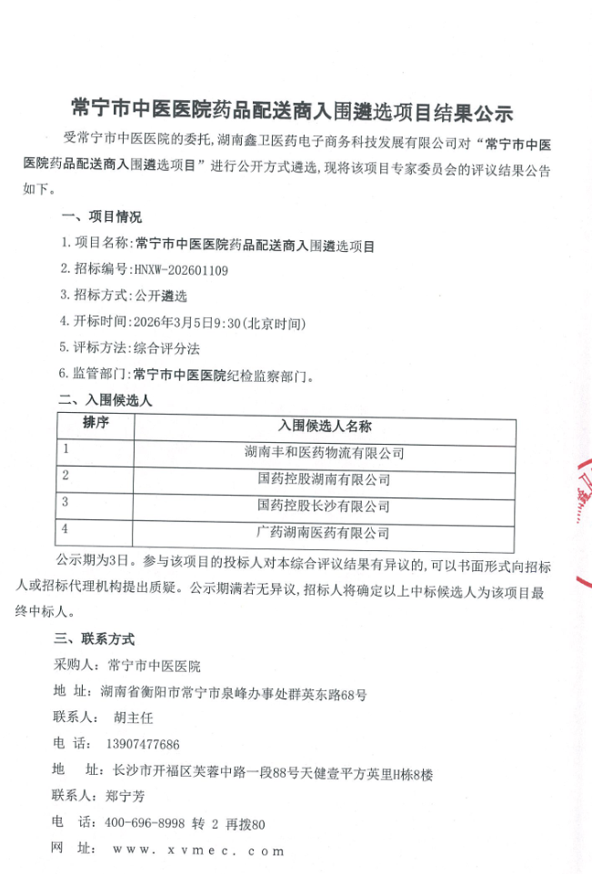 【衡阳市常宁市中医医院】湖南省常宁市中医医院药品配送商入围遴选项目结果公示