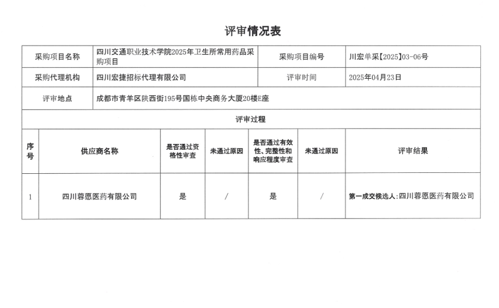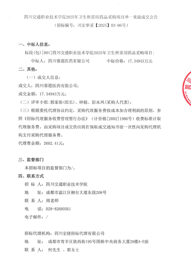 【四川交通职业技术学院】四川交通职业技术学院2025年卫生所常用药品采购项目单一来源成交公告