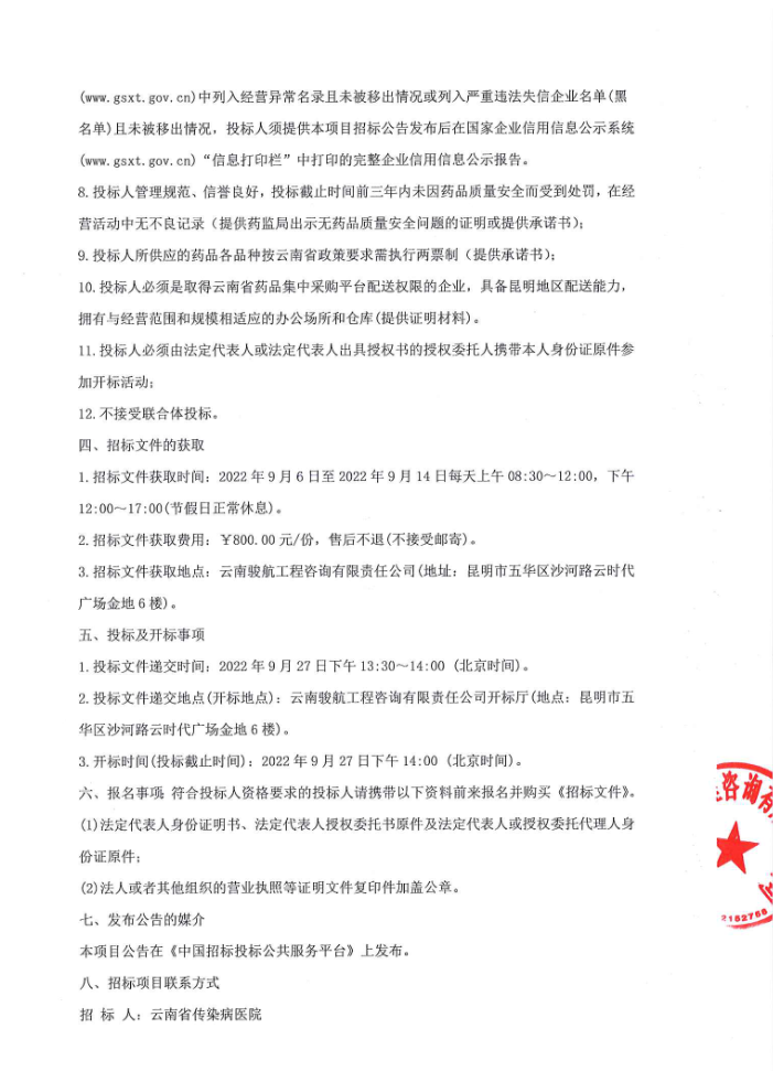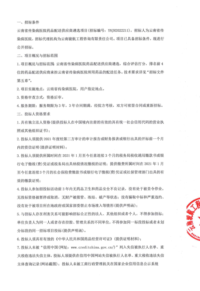 【云南省传染病医院】药品配送供应商遴选项目招标公告