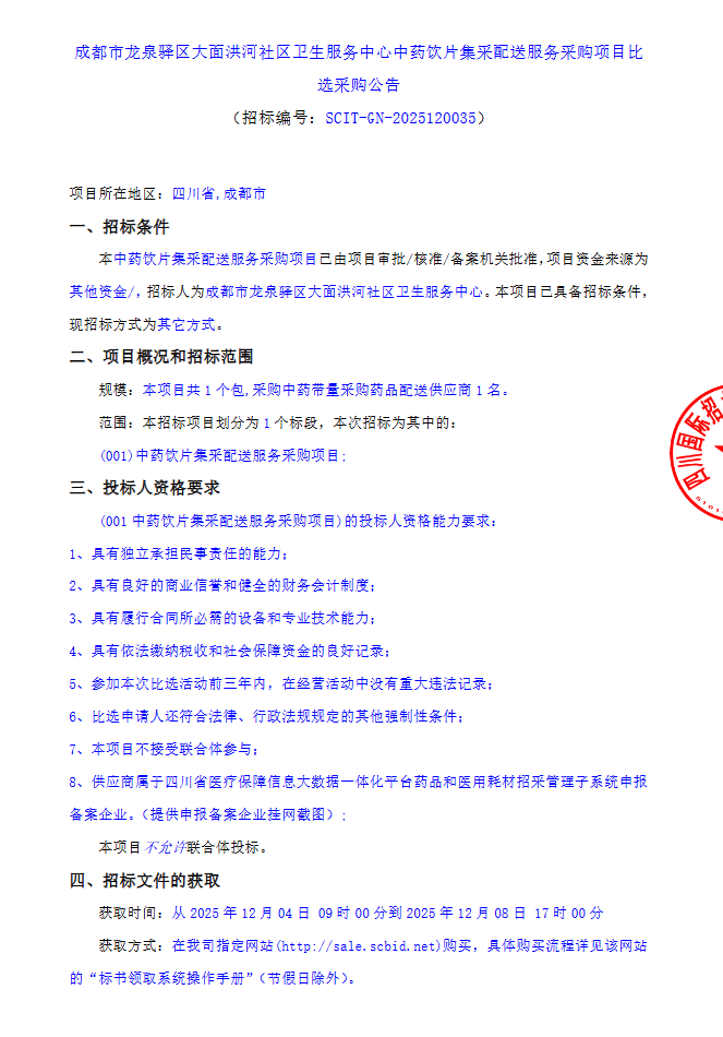 【成都市龙泉驿区大面洪河社区卫生服务中心】四川省成都市龙泉驿区大面洪河社区卫生服务中心中药饮片集采配送服务采购项目比选采购公告