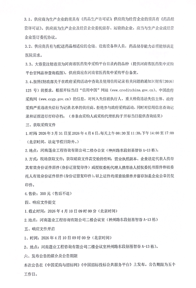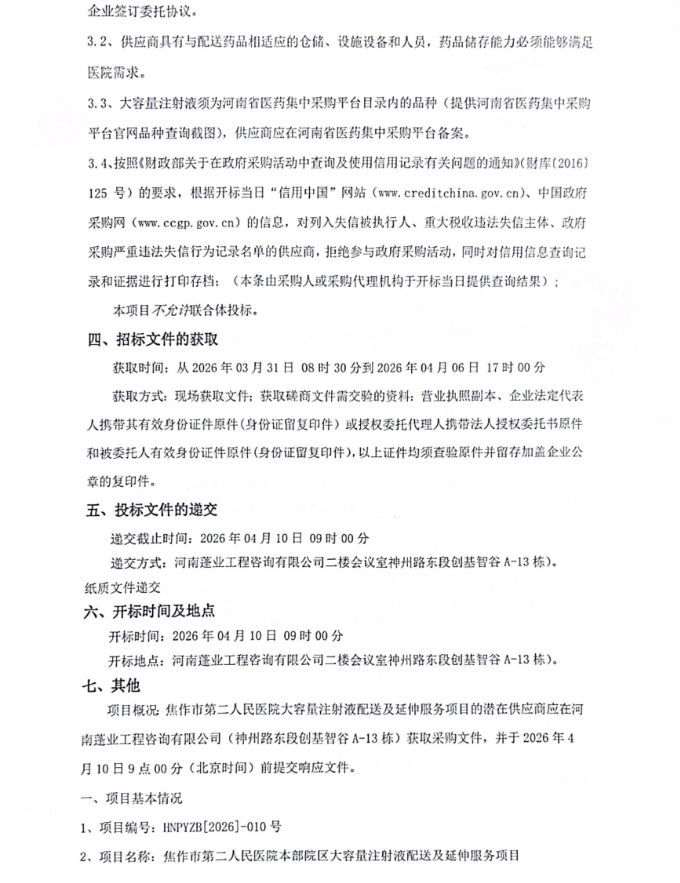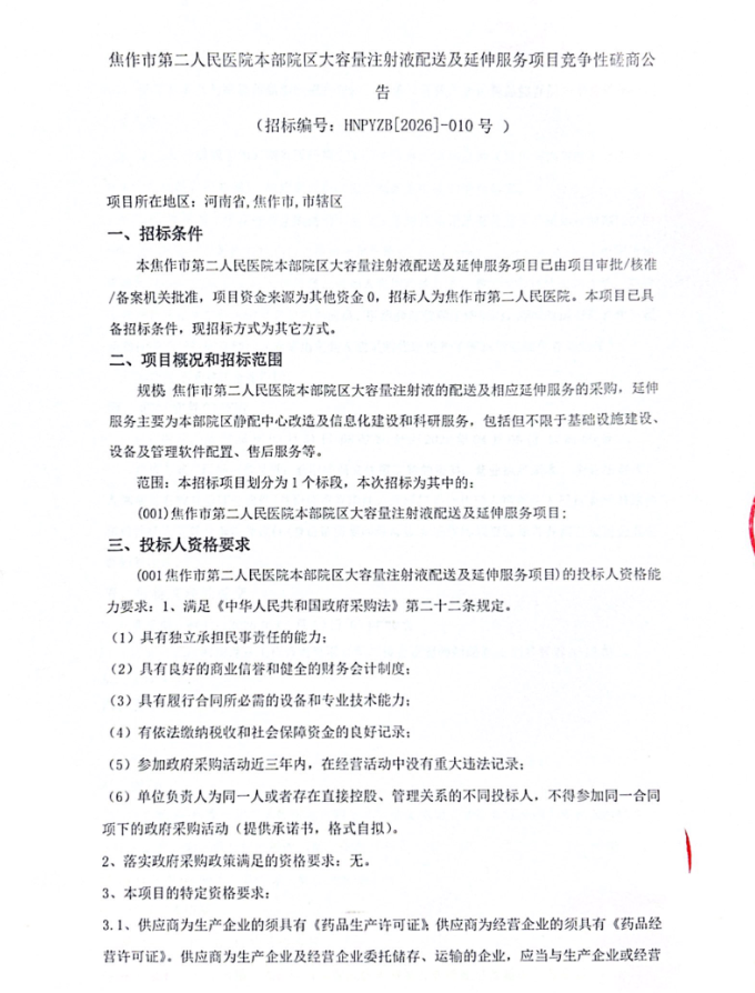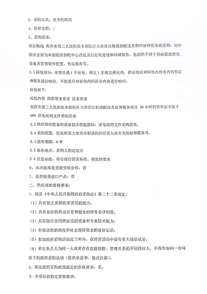 【焦作市第二人民医院】河南省焦作市第二人民医院本部院区大容量注射液配送及延伸服务项目竞争性磋商公告