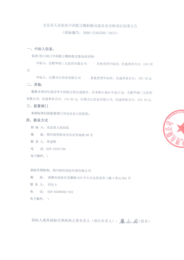 【资阳市安岳县人民医院】四川省资阳市安岳县人民医院中药配方颗粒配送服务商采购项目结果公告