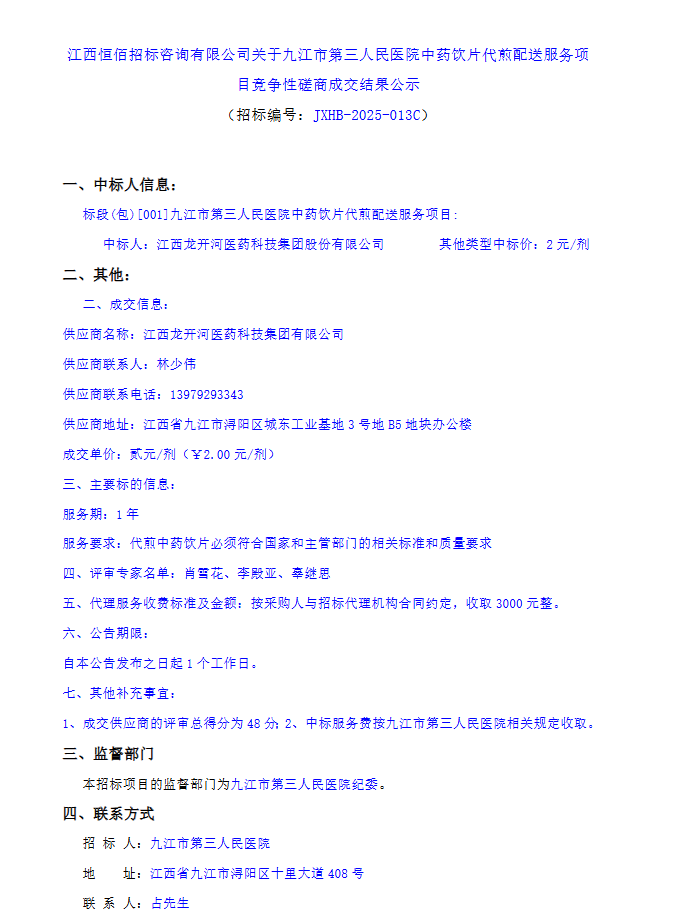 【九江市第三人民医院】江西恒佰招标咨询有限公司关于九江市第三人民医院中药饮片代煎配送服务项目竞争性磋商成交结果公示
