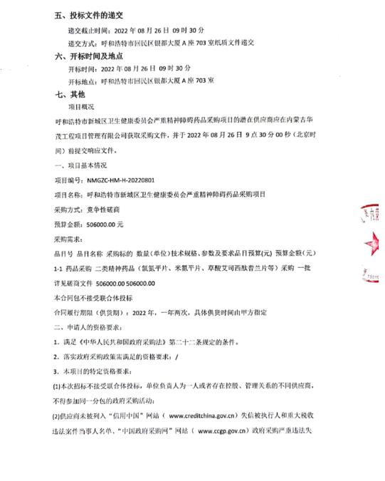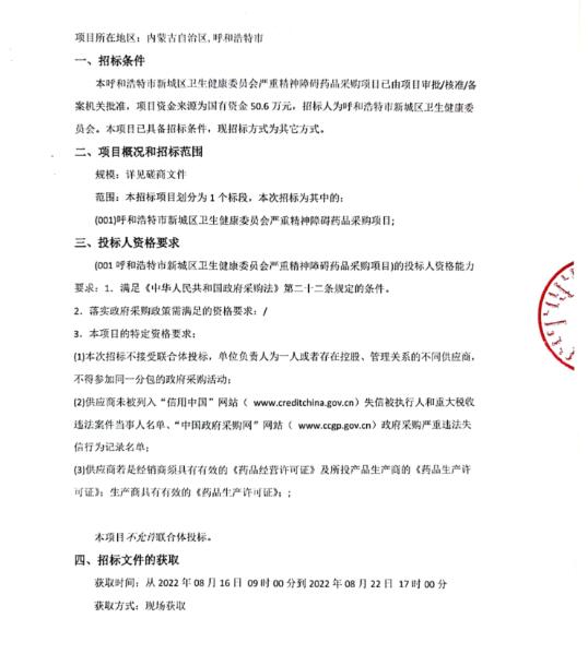 【呼和浩特市新城区卫生健康委员会】呼和浩特市新城区卫生健康委员会严重精神障碍药品采购项目竞争性磋商公告