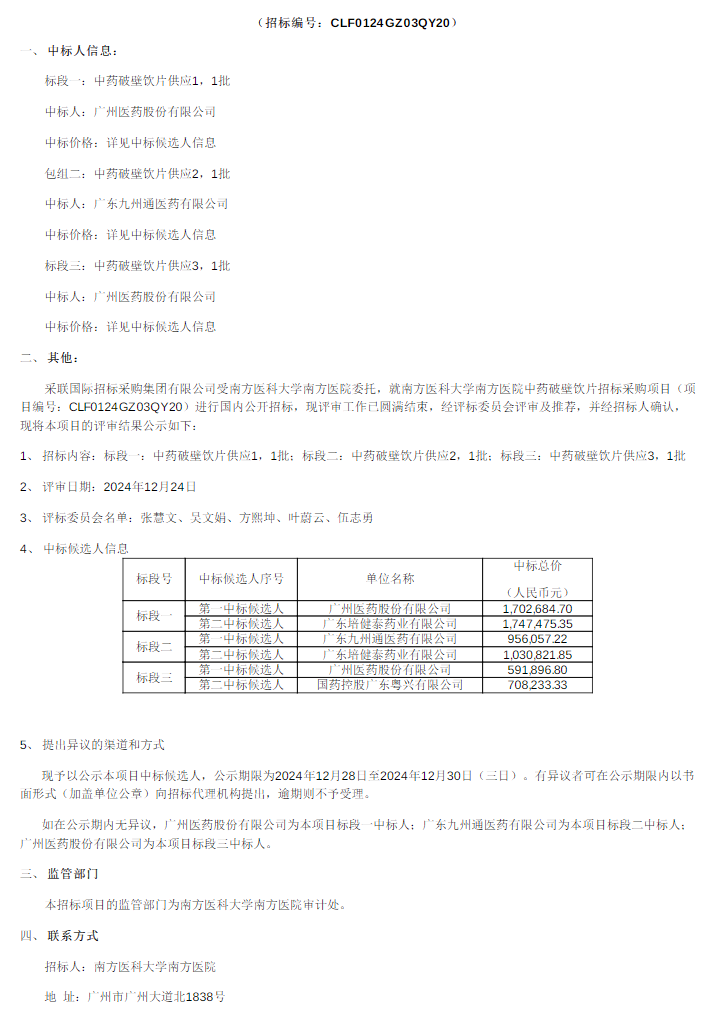 【广州市南方医科大学南方医院】广东省广州市南方医科大学南方医院中药破壁饮片招标采购项目评标结果公示(标段一至标段三)