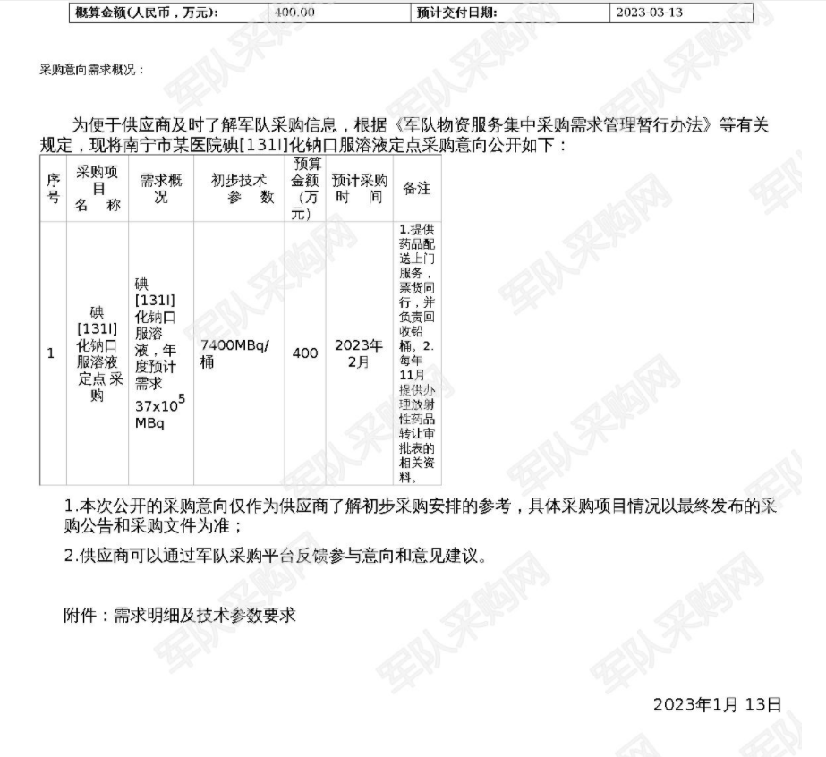 【军队采购】军队采购网南宁市某医院碘〔131I〕化钠口服溶液定点采购意向公开