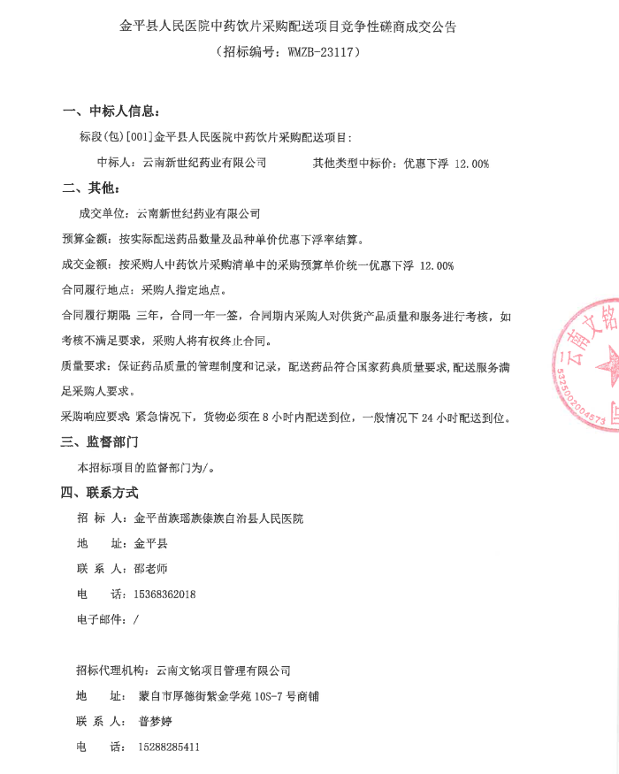 【红河哈尼族彝族自治州金平县人民医院】云南省红河哈尼族彝族自治州金平县人民医院中药饮片采购配送项目竞争性磋商成交公告