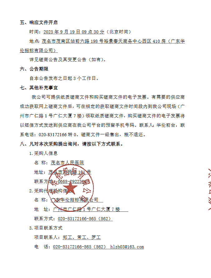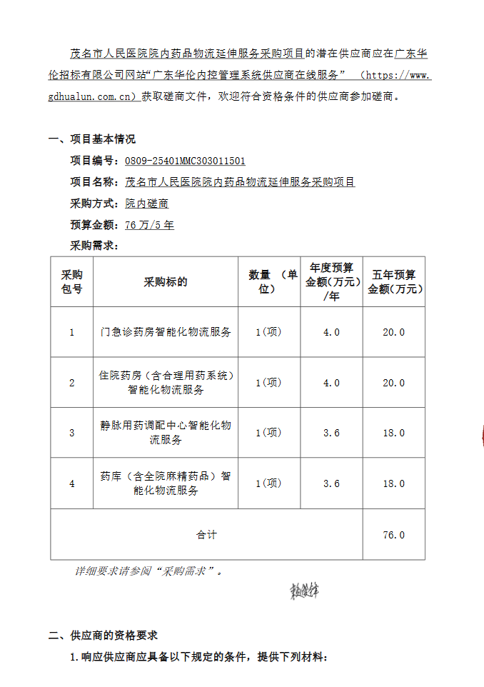 【茂名市人民医院】广东省茂名市人民医院院内药品物流延伸服务采购项目(0809-25401MMC303011501)院内磋商公告