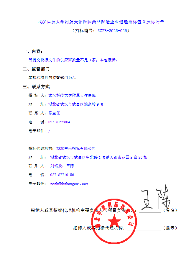 【武汉科技大学附属天佑医院】湖北省武汉科技大学附属天佑医院药品配送企业遴选招标包3废标公告