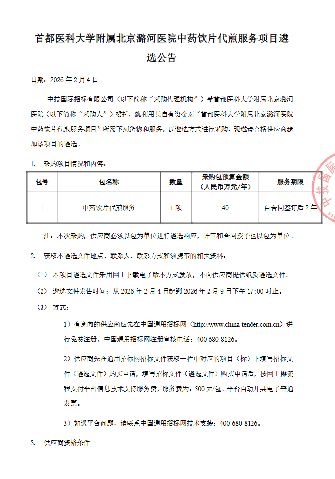 【首都医科大学附属北京潞河医院】北京市首都医科大学附属北京潞河医院中药饮片代煎服务项目遴选公告