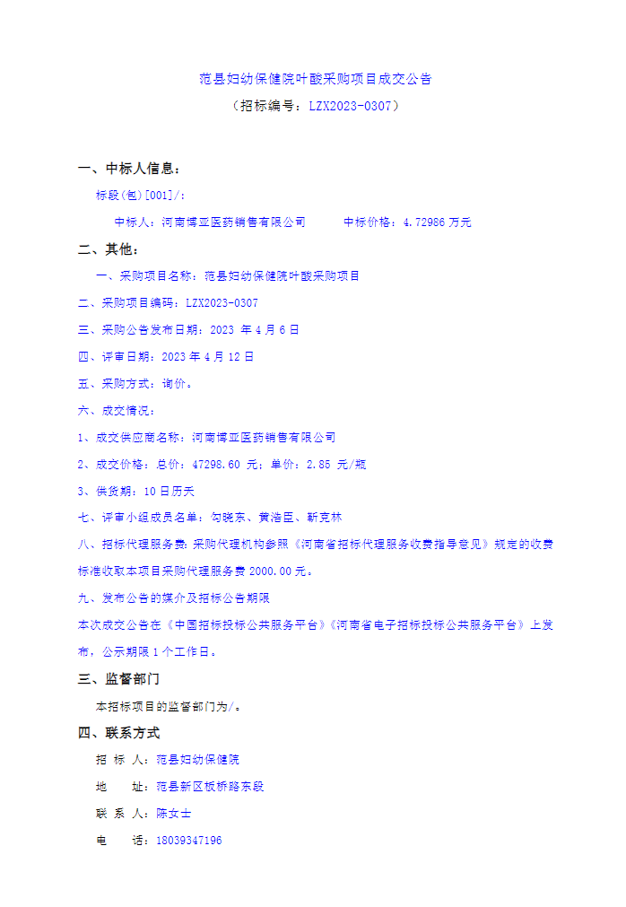 【濮阳市范县妇幼保健院】河南省濮阳市范县妇幼保健院叶酸采购项目成交公告