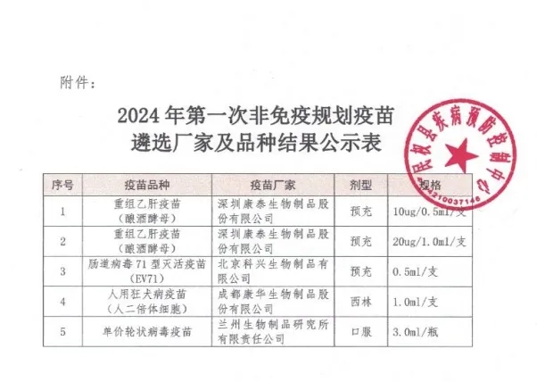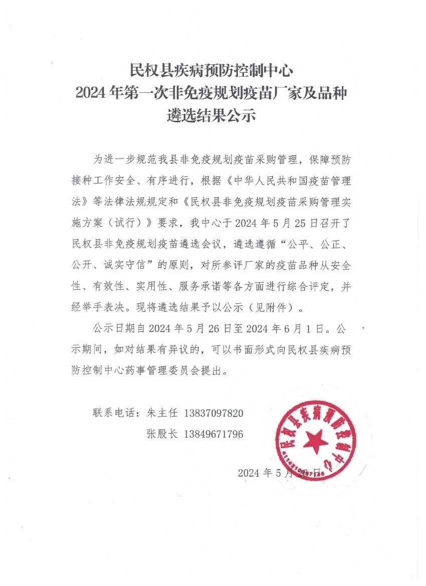 【商丘】民权县疾病预防控制中心2024年第一次非免疫规划疫苗厂家及品种遴选结果公示