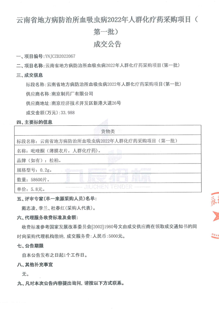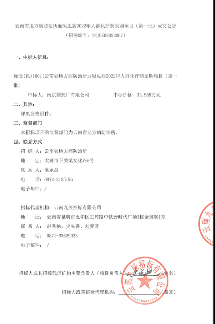 【云南省地方病防治所血吸虫病】2022年人群化疗药采购项目(第一批)成交公告