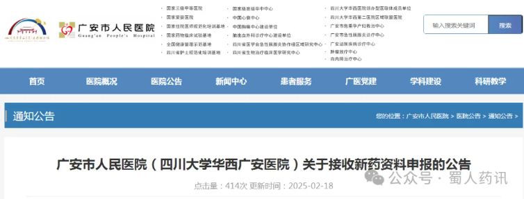 根据广安市人民医院(四川大学华西广安医院)临床诊疗实际需求,医院拟于近日接收新药资料,现将相关事宜说明如下: