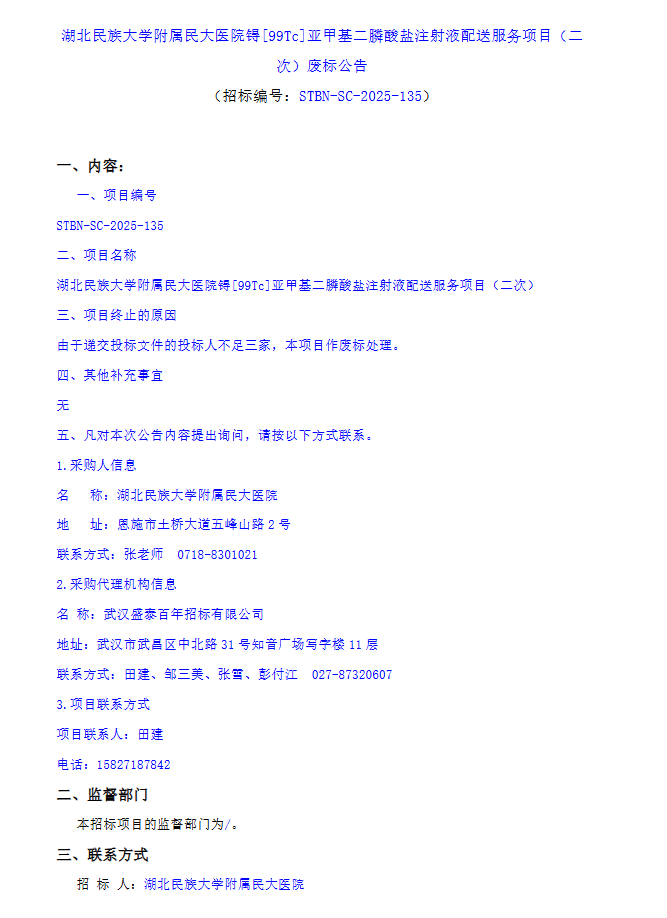 【湖北民族大学附属民大医院】湖北民族大学附属民大医院锝〔99Tc〕亚甲基二膦酸盐注射液配送服务项目(二次)废标公告