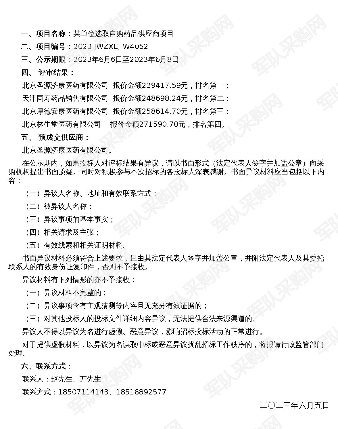 【军队采购】军队采购网某单位选取自购药品供应商项目询价结果公示(2023-JWZXEJ-W4052)