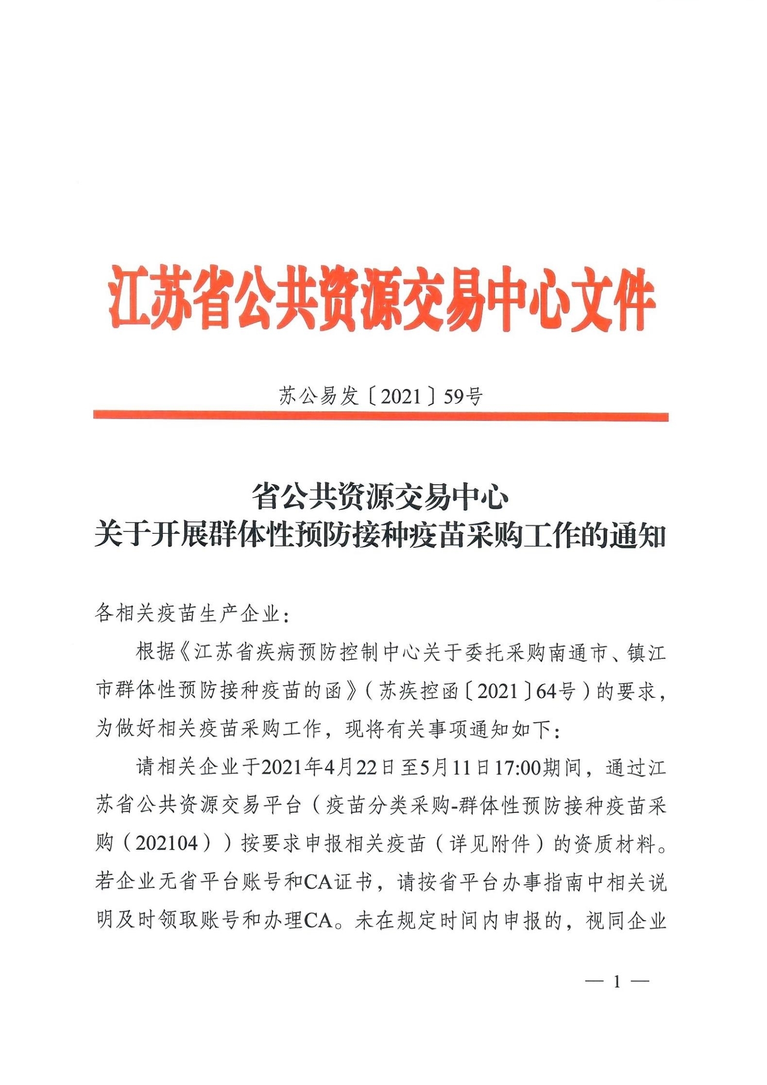 【江苏】2021年江苏省公共资源交易中心关于开展群体性预防接种疫苗采购工作的通知 苏公易发[2021]59号