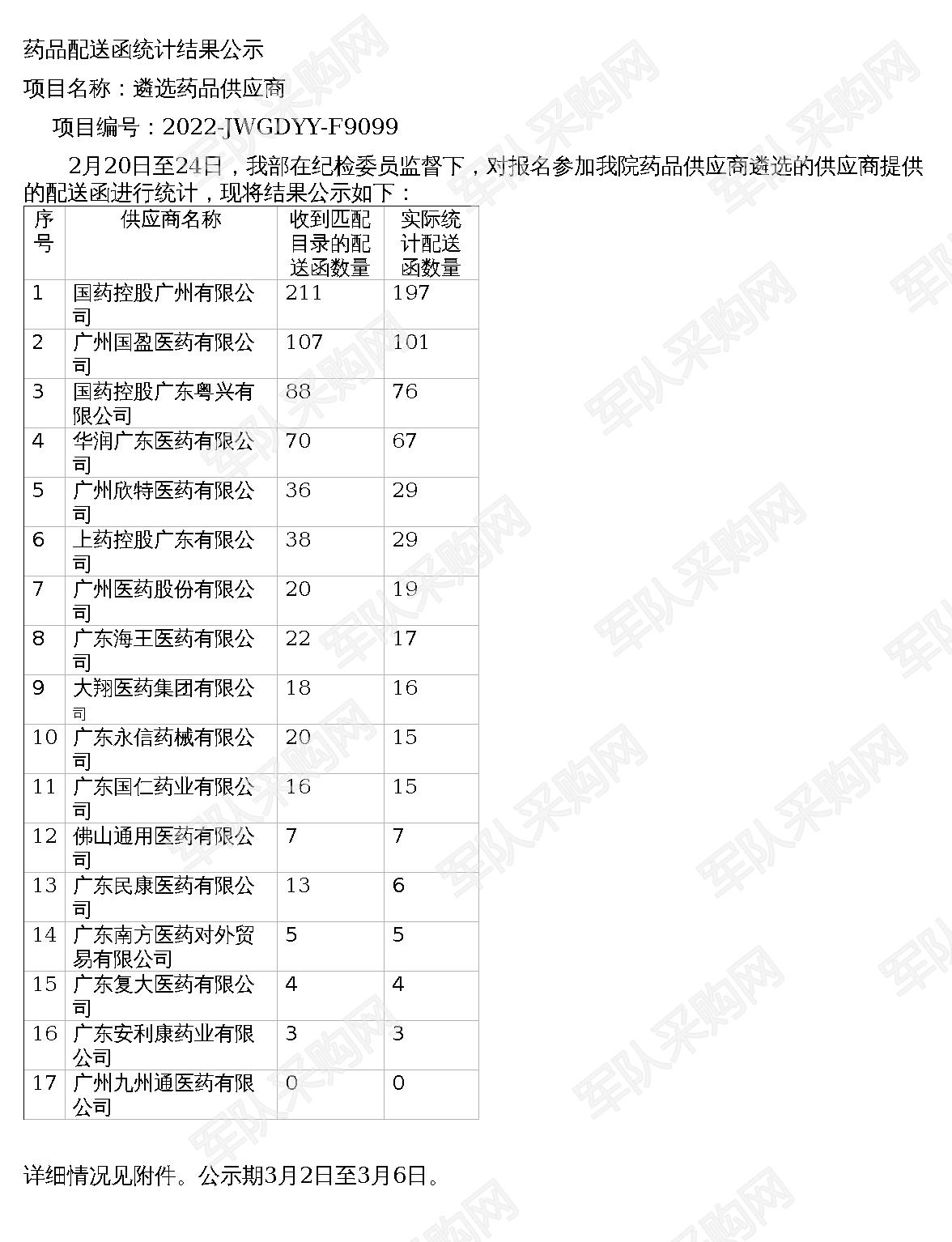 【军队采购】军队采购网药品配送函统计结果公示(2022-JWGDYY-F9099)