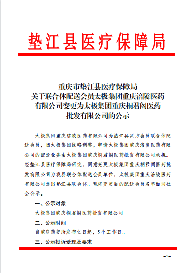 太极集团重庆涪陵医药有限公司为垫江县买方会员联合体配送会员,因太极集团战略调整,申请太极集团重庆涪陵医药有限公司的配送业务由太极集团重庆桐君阁医药批发有限公司承担。经垫江县医疗保障局研究,同意变更太极集团重庆桐君阁医药批发有限公司为我县联合体配送会员单位,太极集团重庆涪陵医药有限公司退出垫江县联合体。现将变更后的配送会员名单面向社会公示。