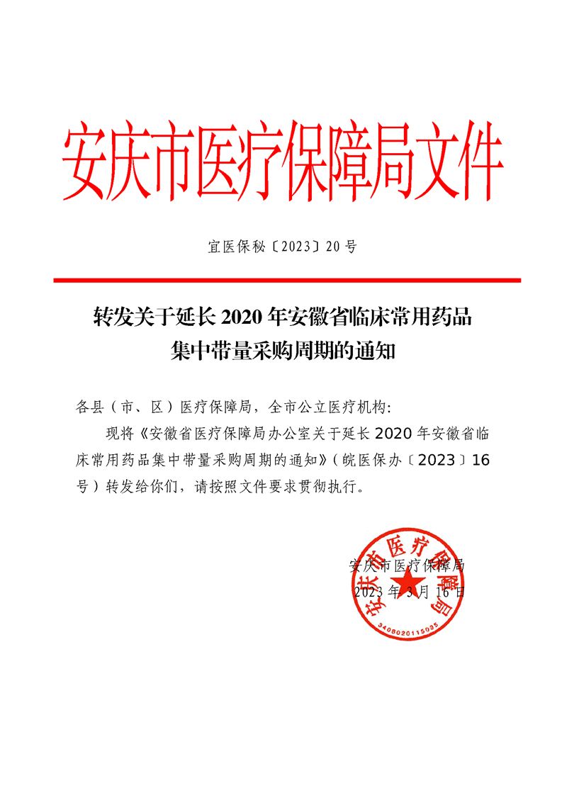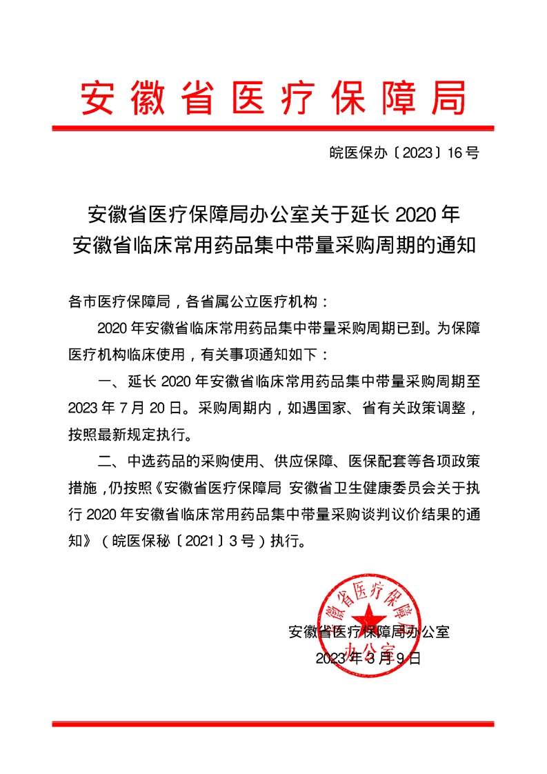 现将《安徽省医疗保障局办公室关于延长2020年安徽省临床常用药品集中带量采购周期的通知》(皖医保办〔2023〕16 号)转发给你们,请按照文件要求贯彻执行。