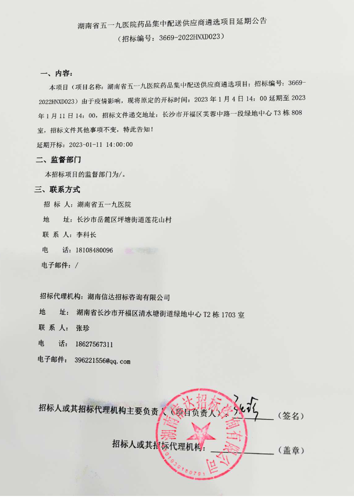 【湖南省五一九医院】湖南省五一九医院药品集中配送供应商遴选项目延期公告