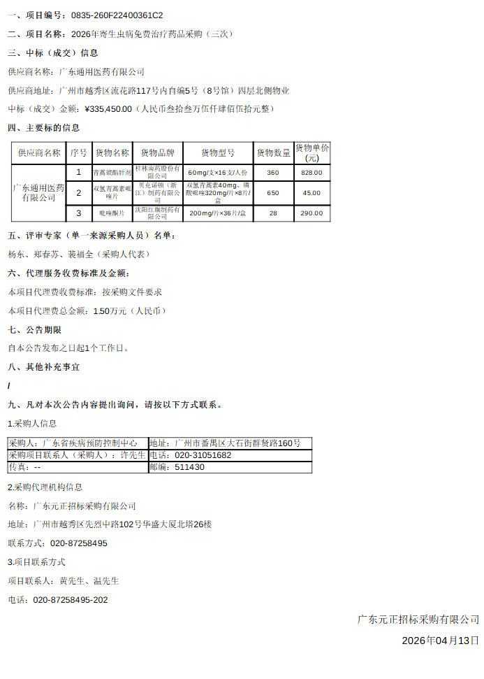 【广东省疾病预防控制中心】广东省疾病预防控制中心2026年寄生虫病免费治疗药品采购(三次)(项目编号:0835-260F22400361C2)中标(成交)结果公告