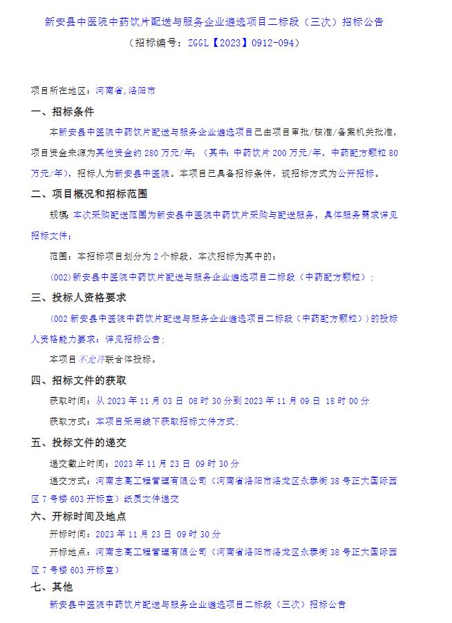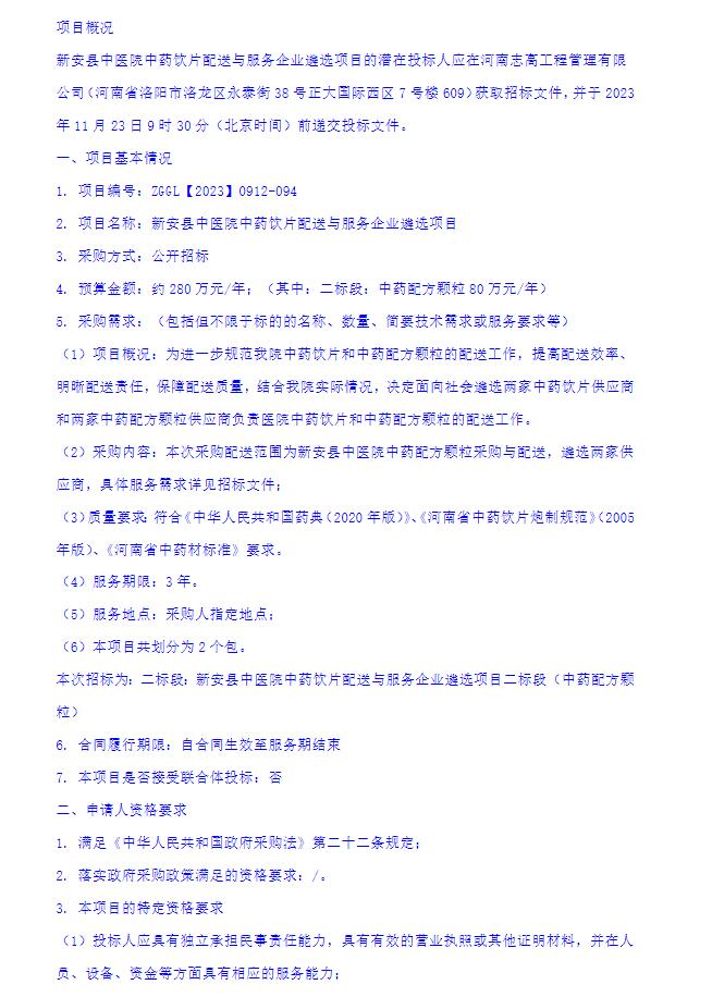 【洛阳市新安县中医院】河南省洛阳市新安县中医院中药饮片配送与服务企业遴选项目二标段(三次)招标公告