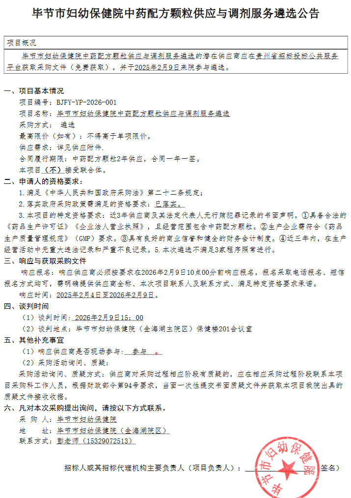 【毕节市妇幼保健院】贵州省毕节市妇幼保健院中药配方颗粒供应与调剂服务遴选公告(二次)