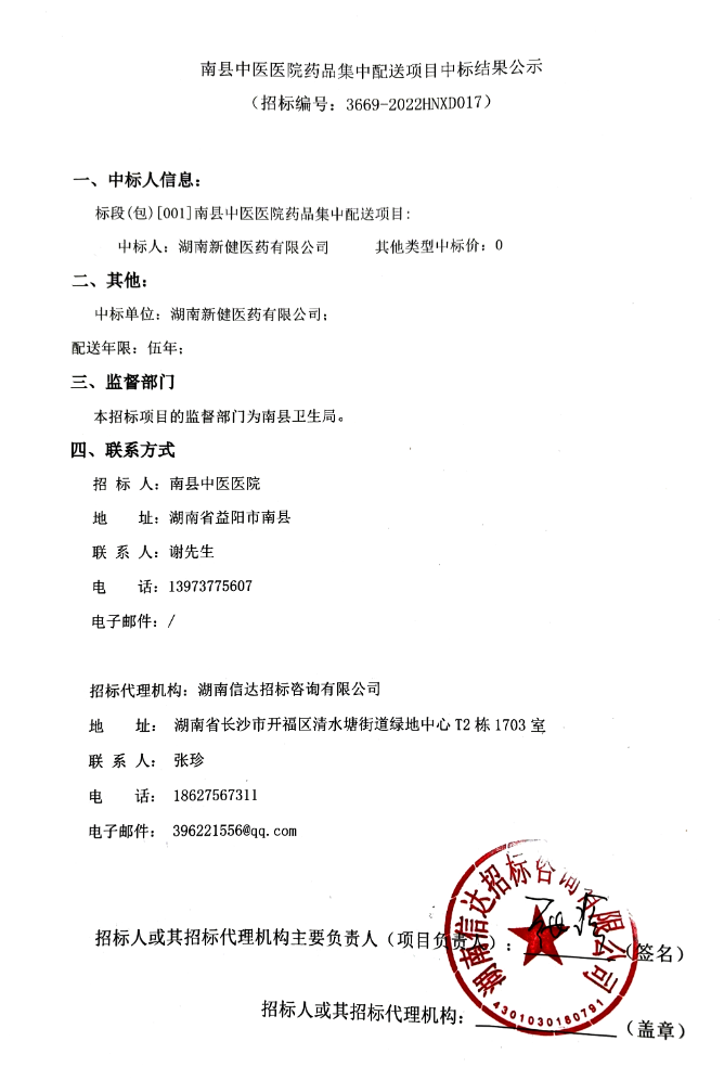 【益阳市南县中医医院】湖南省益阳市南县中医医院药品集中配送项目中标结果公示