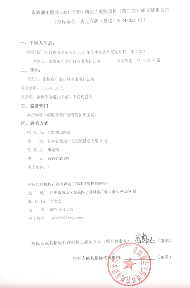 【酒泉市敦煌市青海油田医院】甘肃省酒泉市敦煌市青海油田医院2024年度中药饮片采购项目(第二次)成交结果公告
