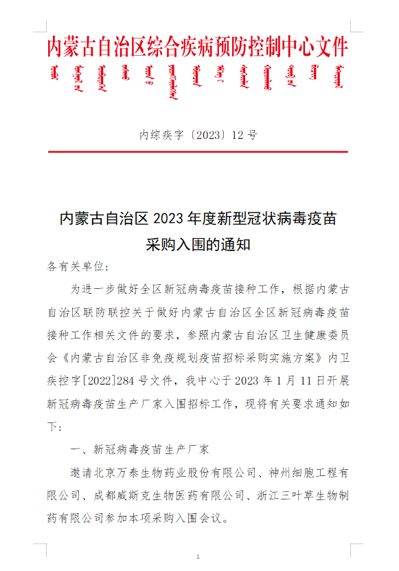 为进一步做好全区新冠病毒疫苗接种工作,根据内蒙古自治区联防联控关于做好内蒙古自治区全区新冠病毒疫苗接种工作相关文件的要求,参照内蒙古自治区卫生健康委员会《内蒙古自治区非免疫规划疫苗招标采购实施方案》内卫疾控字【2022】284号文件,我中心于2023年1月11日开展新冠病毒疫苗生产厂家入围招标工作,现将有关要求通知如下: