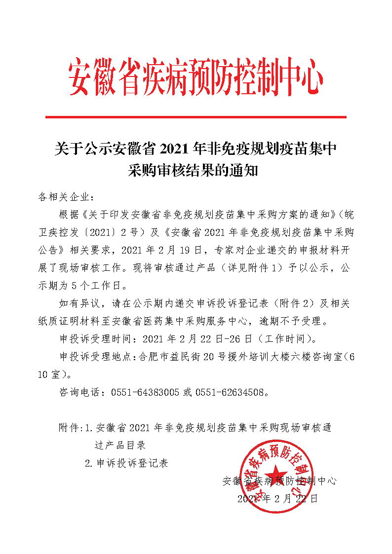 【安徽】2021年安徽省关于公示安徽省2021年非免疫规划疫苗集中采购审核结果的通知