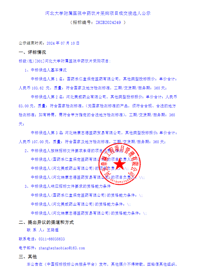 【河北大学附属医院】河北大学附属医院中药饮片采购项目成交候选人公示