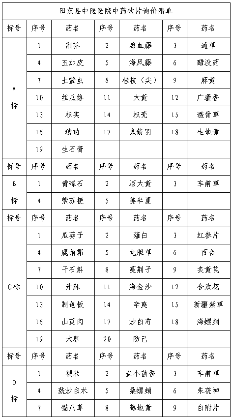 据田东县中医医院发展的需要,我院就荆芥等53种中药饮片进行询价,欢迎符合资格条件的厂商参与。现将询价内容公告如下: