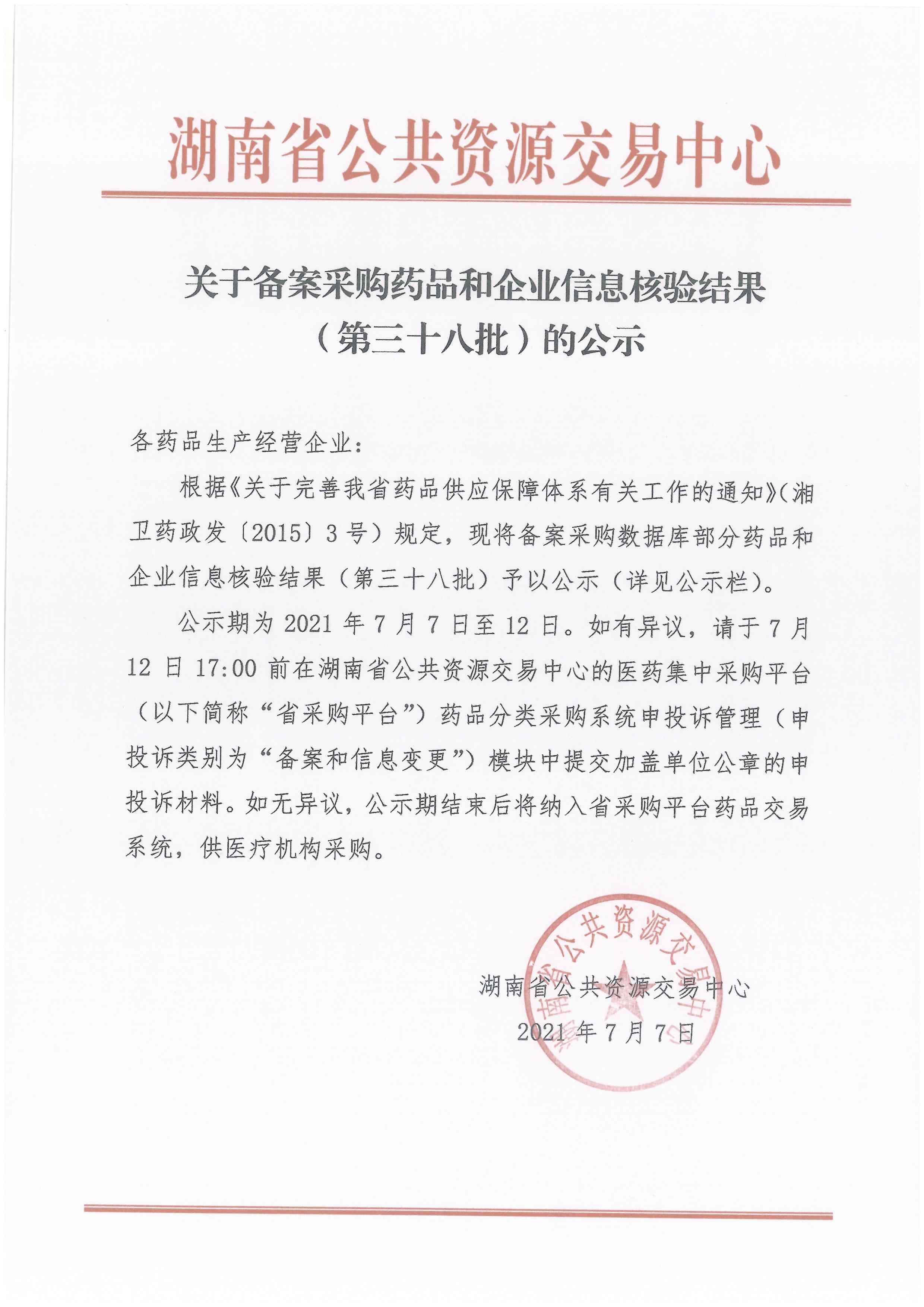 【湖南】2021年湖南省关于备案采购药品和企业信息核验结果(第三十八批)的公示