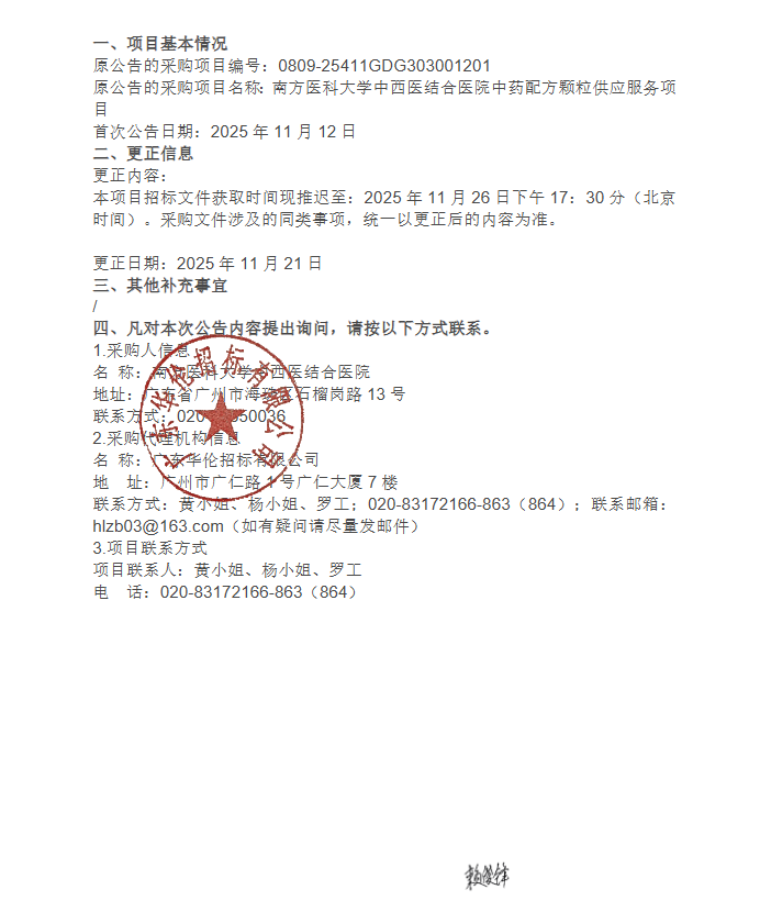 【南方医科大学中西医结合医院】广东省南方医科大学中西医结合医院中药配方颗粒供应服务项目(0809-25411GDG303001201)延长报名公告