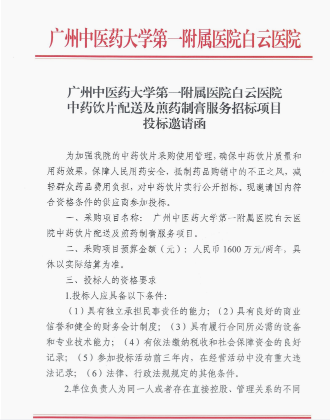 【广州中医药大学第一附属医院白云医院】广东省广州中医药大学第一附属医院白云医院中药饮片配送及煎药制膏服务招标项目