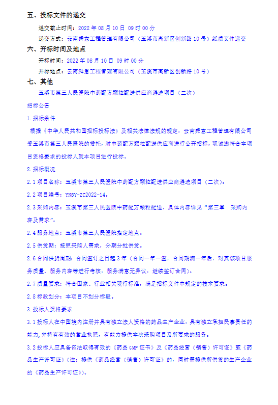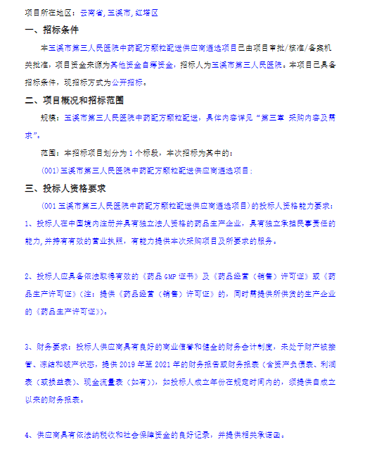 【玉溪市第三人民医院】玉溪市第三人民医院中药配方颗粒配送供应商遴选项目(二次)招标