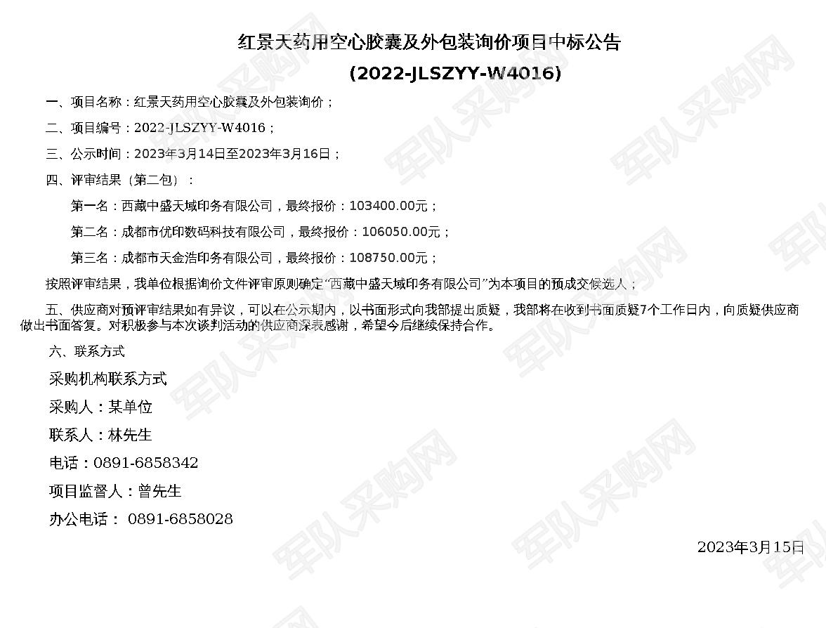 【军队采购】军队采购网红景天药用空心胶囊及外包装询价项目中标公告(2022-JLSZYY-W4016)