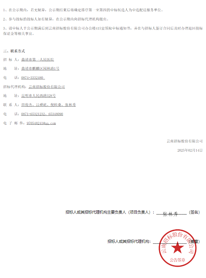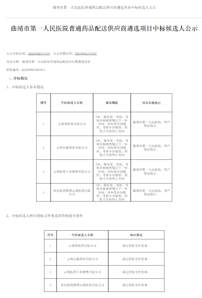 【曲靖市第一人民医院】云南省曲靖市第一人民医院普通药品配送供应商遴选项目中标候选人公示
