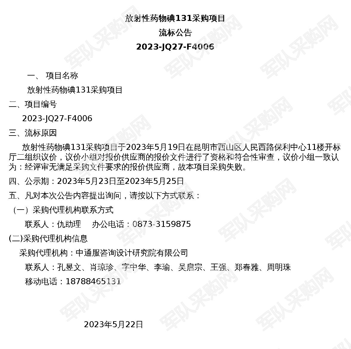 【军队采购】军队采购网放射性药物碘131采购项目流标公告+2023-JQ27-F4006