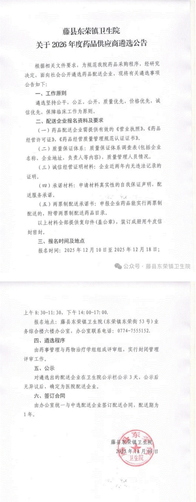 【梧州市藤县东荣镇卫生院】广西壮族自治区梧州市藤县东荣镇卫生院关于2026年度药品供应商遴选公告
