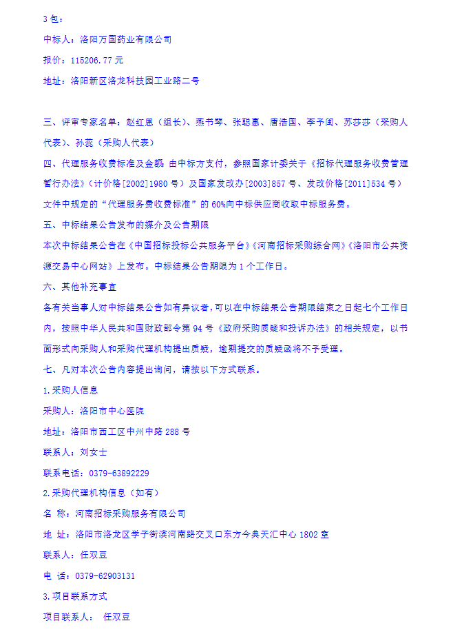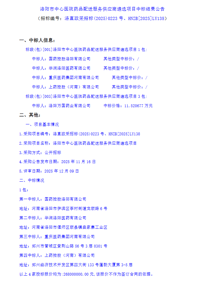 【洛阳市中心医院】河南省洛阳市中心医院药品配送服务供应商遴选项目中标结果公告