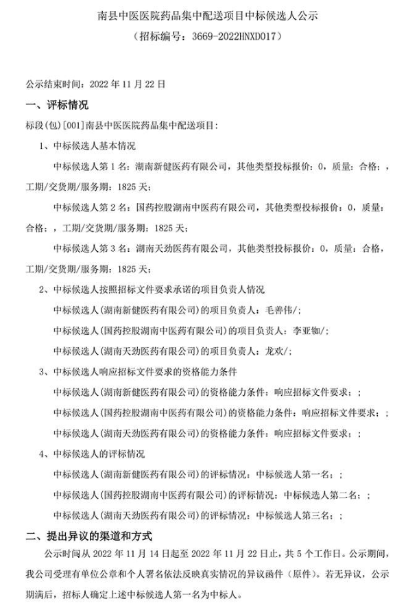 中标候选人第2名∶国药控股湖南中医药有限公司,其他类型投标报价∶0,质量∶合格∶,工期/交货期/服务期∶1825天∶