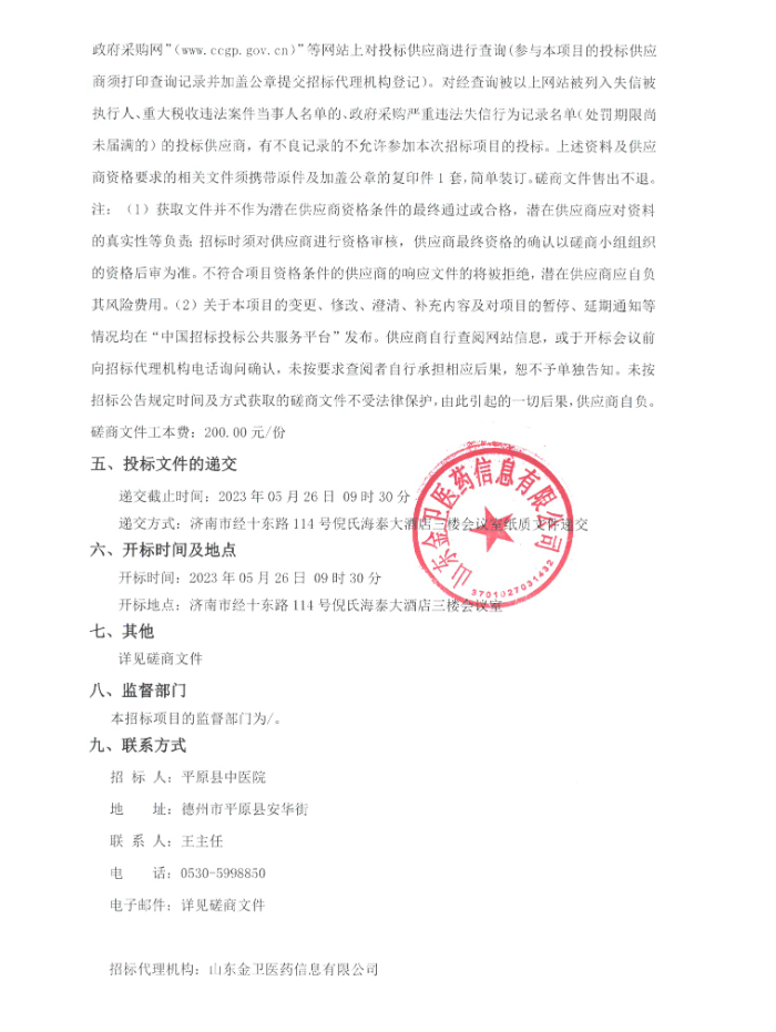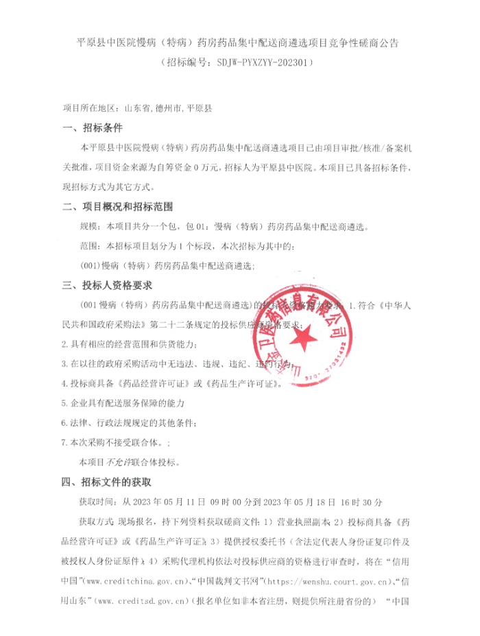 【德州市平原县中医院】山东省德州市平原县中医院慢病(特病)药房药品集中配送商遴选项目竞争性磋商公告