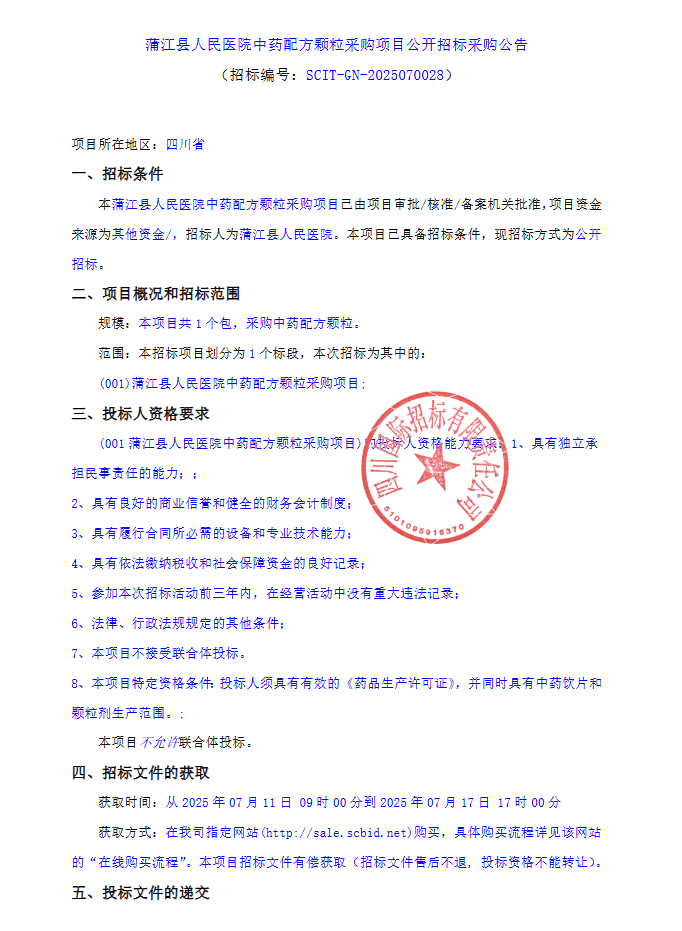 【成都市蒲江县人民医院】四川省成都市蒲江县人民医院中药配方颗粒采购项目公开招标采购公告