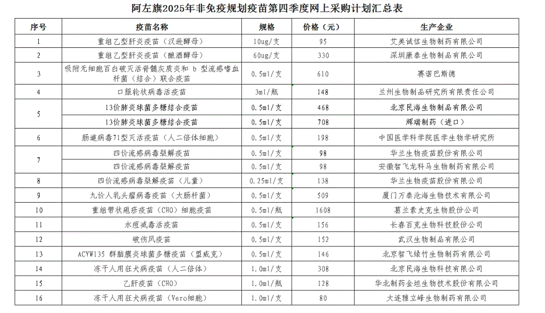 为保障人民群众身体健康,进一步规范全旗非免疫规划疫苗采购管理,确保非免疫规划疫苗供应,防范非免疫规划疫苗在采购、使用过程中发生违法、违规行为。经阿拉善左旗非免疫规划疫苗采购领导小组第四季度会议集体决策,我中心将通过内蒙古自治区非免疫规划疫苗网上招采平台(自治区公共资源交易平台子系统)进行采购,此次共采购16种疫苗,现将2025年第四季度非免疫规划疫苗采购厂家及价格公示如下: