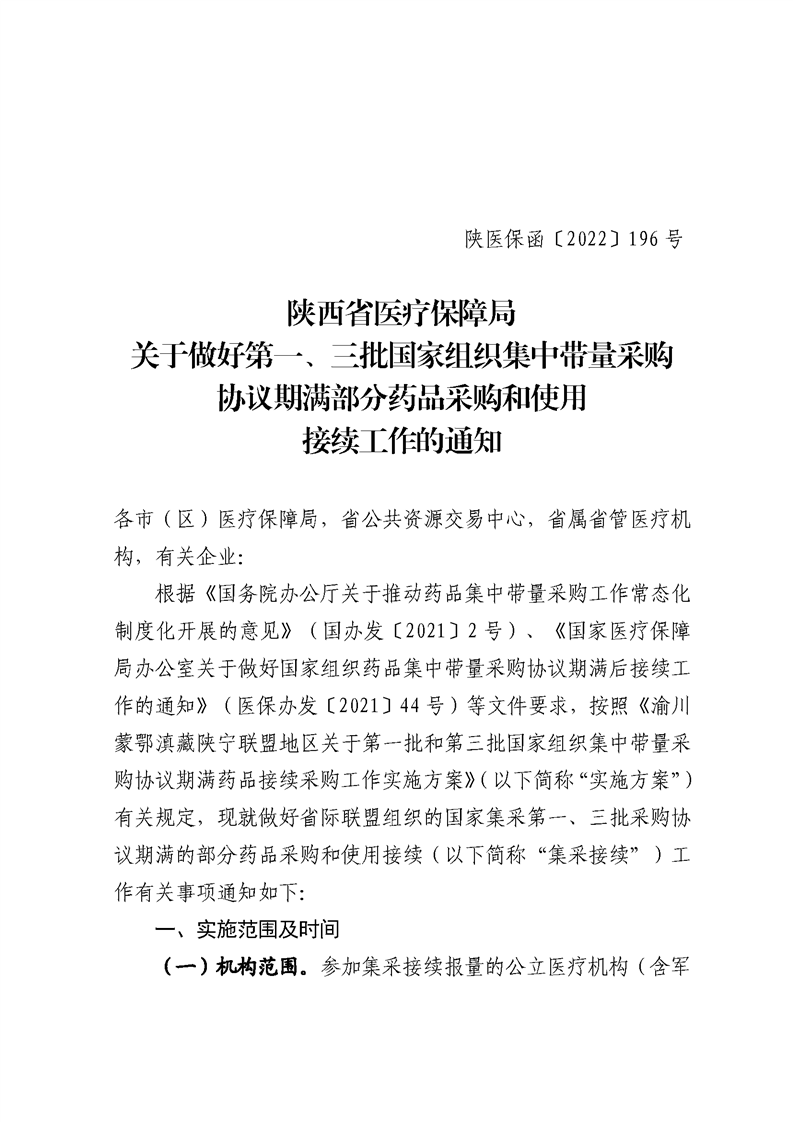 根据《国务院办公厅关于推动药品集中带量采购工作常态化制度化开展的意见》(国办发〔2021〕2号)、《国家医疗保障局办公室关于做好国家组织药品集中带量采购协议期满后接续工作的通知》(医保办发〔2021〕44号)等文件要求,按照《渝川蒙鄂滇藏陕宁联盟地区关于第一批和第三批国家组织集中带量采购协议期满药品接续采购工作实施方案》(以下简称“实施方案”)有关规定,现就做好省际联盟组织的国家集采第一、三批采购协议期满的部分药品采购和使用接续(以下简称“集采接续”)工作有关事项通知如下∶