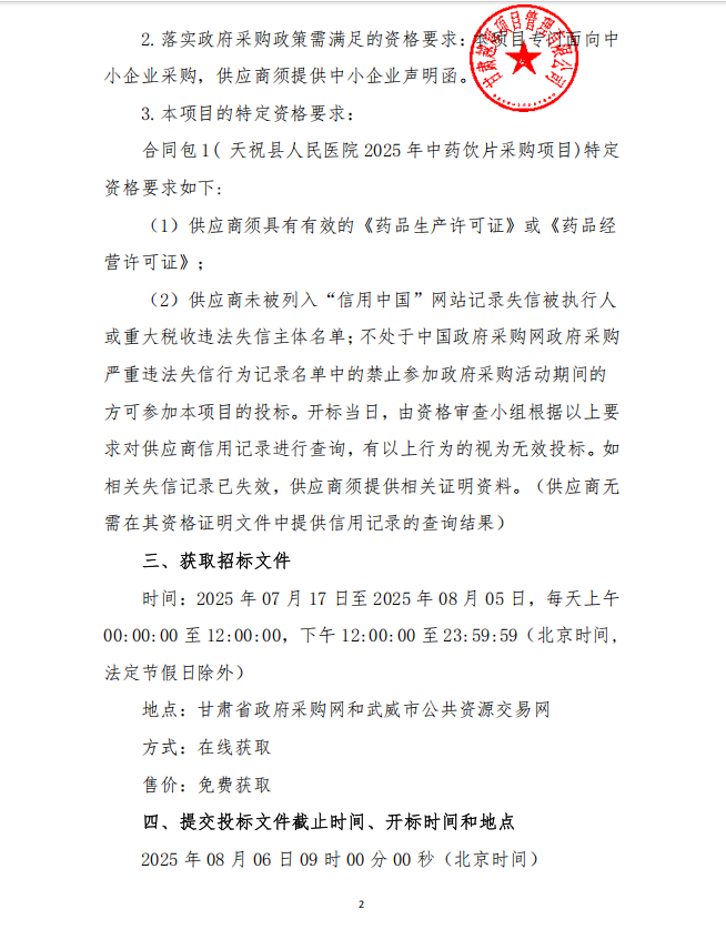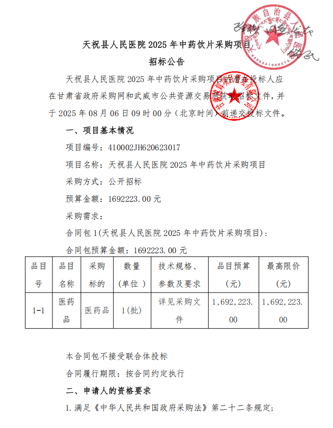 【武威市天祝县人民医院】甘肃省武威市天祝县人民医院2025年中药饮片采购项目正常公告